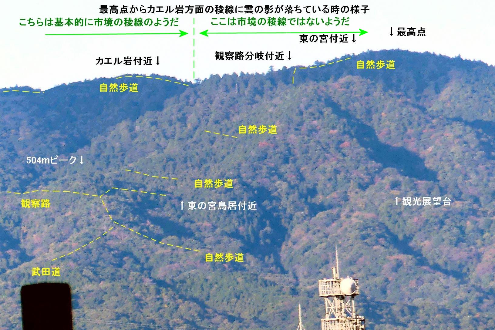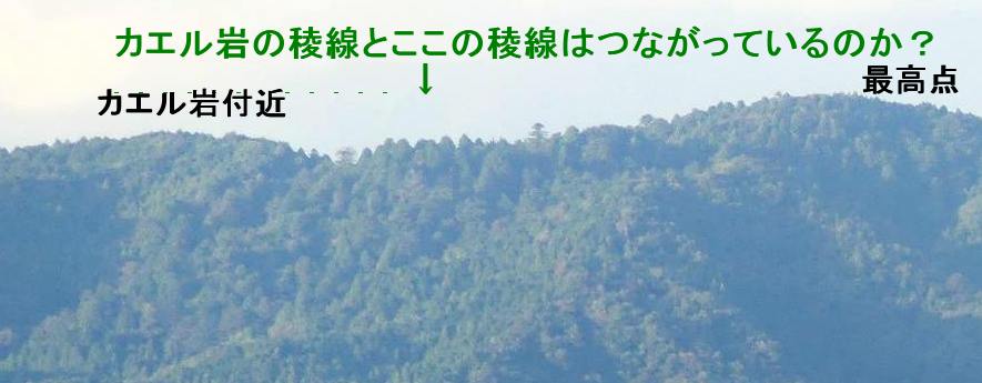 ところで最高点付近の地形はわかりにくい。特に、最高点の左側に大木が密集しており目立つが、これら大木が、最高点とカエル岩の稜線の一部なのか、どこに生えているのか、上述の写真では判別できない。