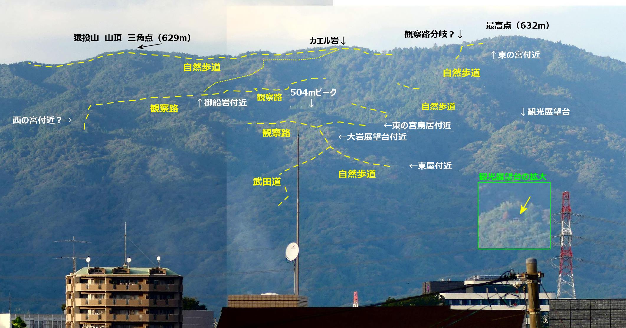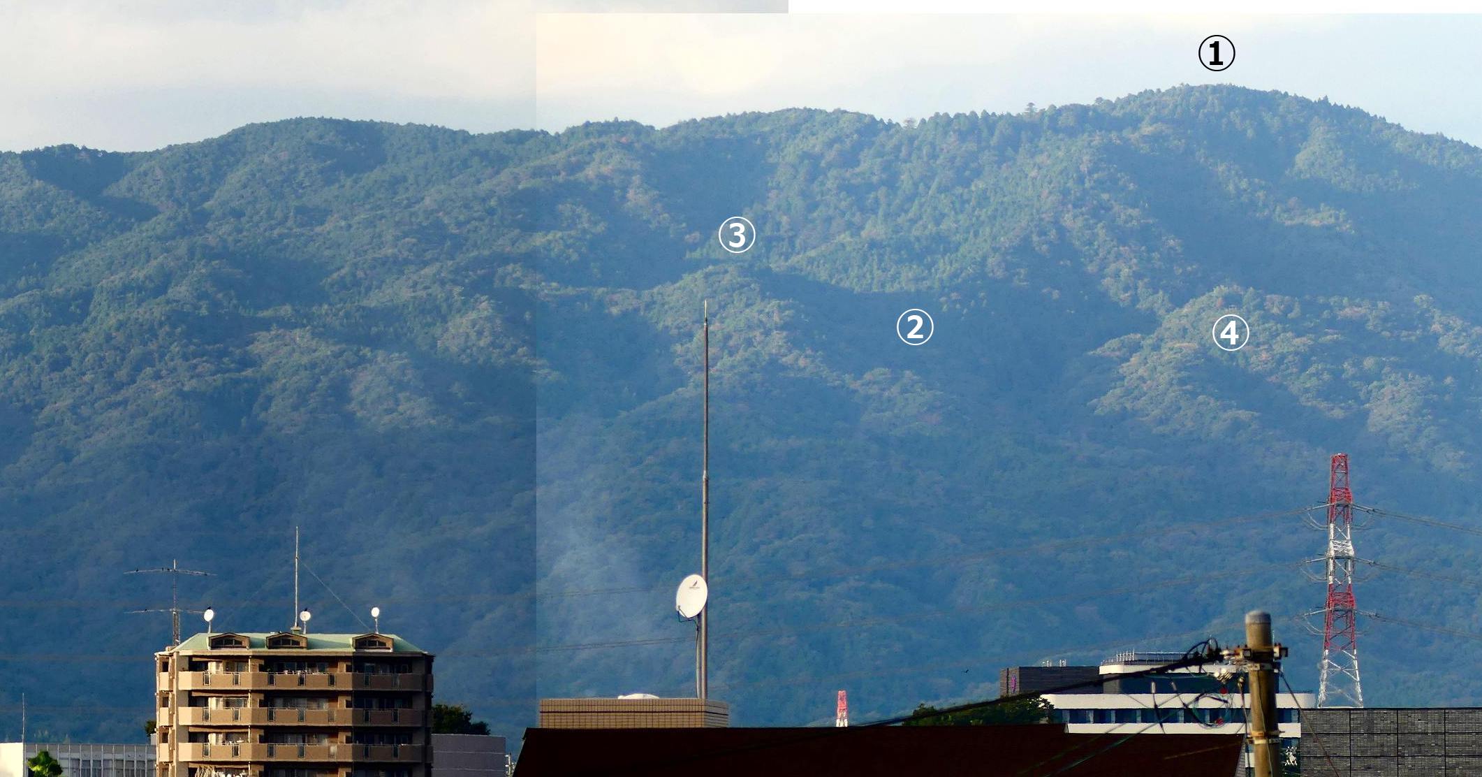この推測を証明するため写真をよく調べると、条件が良い時には、504mピークの東側(右側)に、谷を挟んで観光展望台らしきもの④が確認できるので、ここまでの推論が正しいことがわかる。