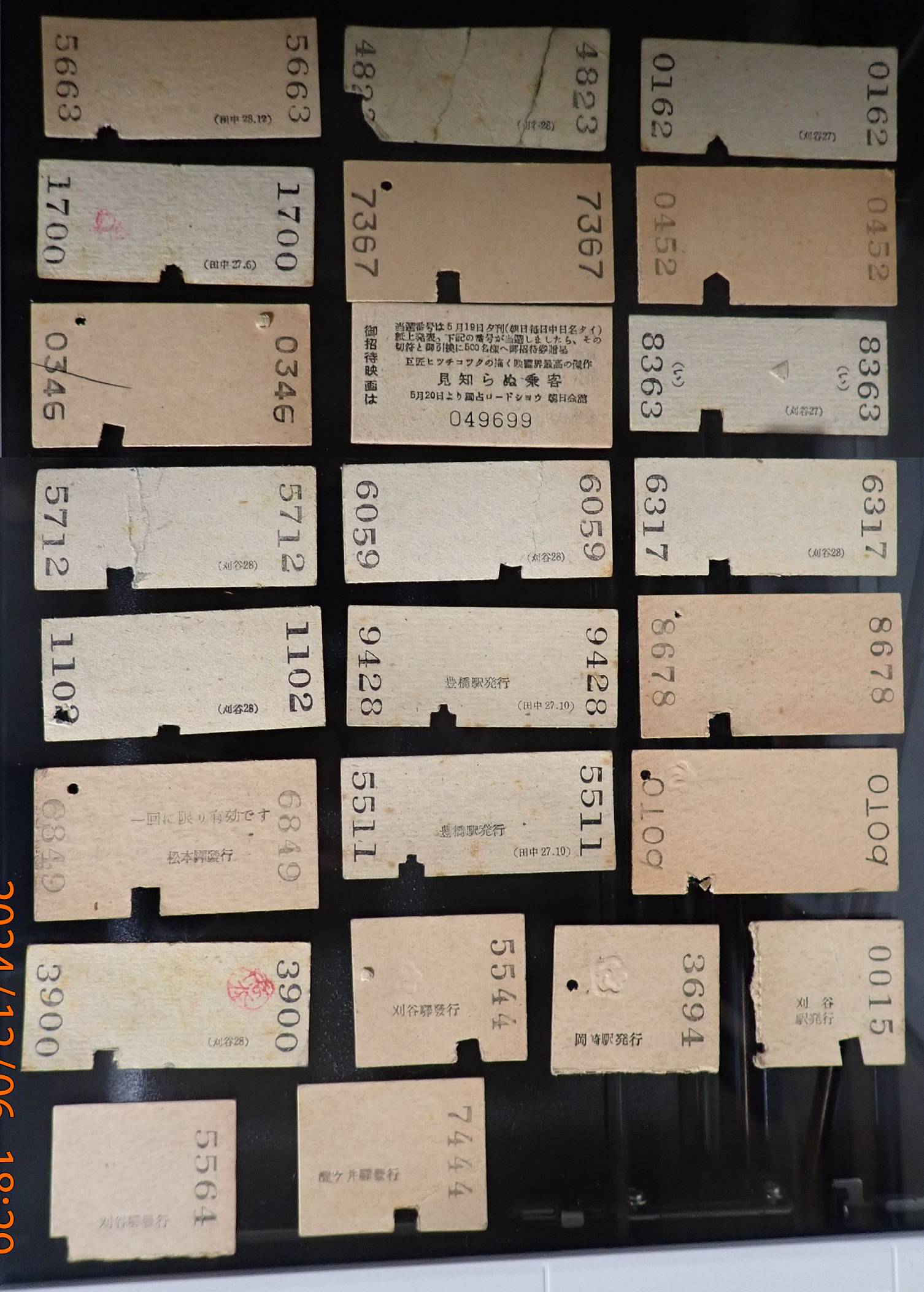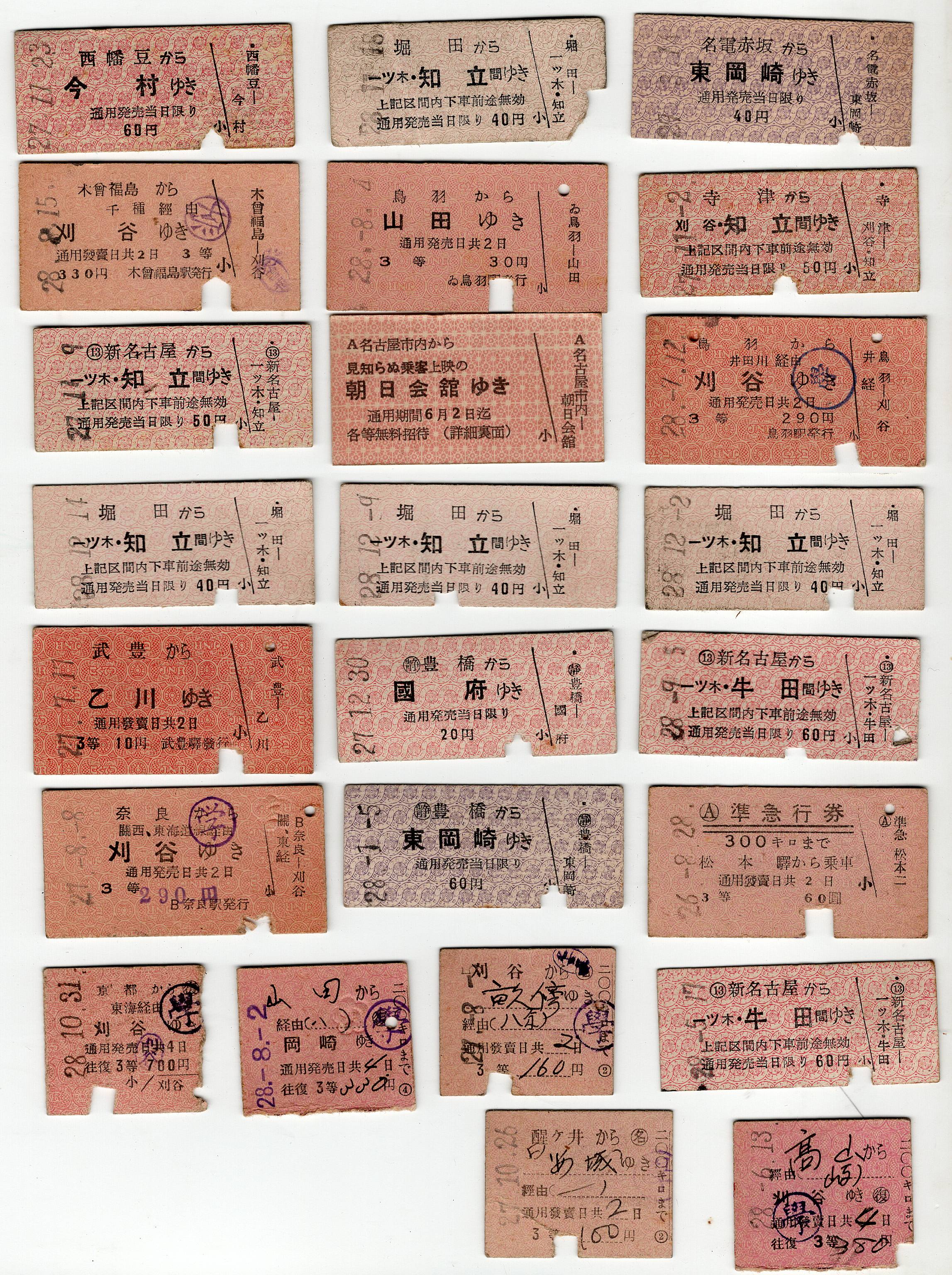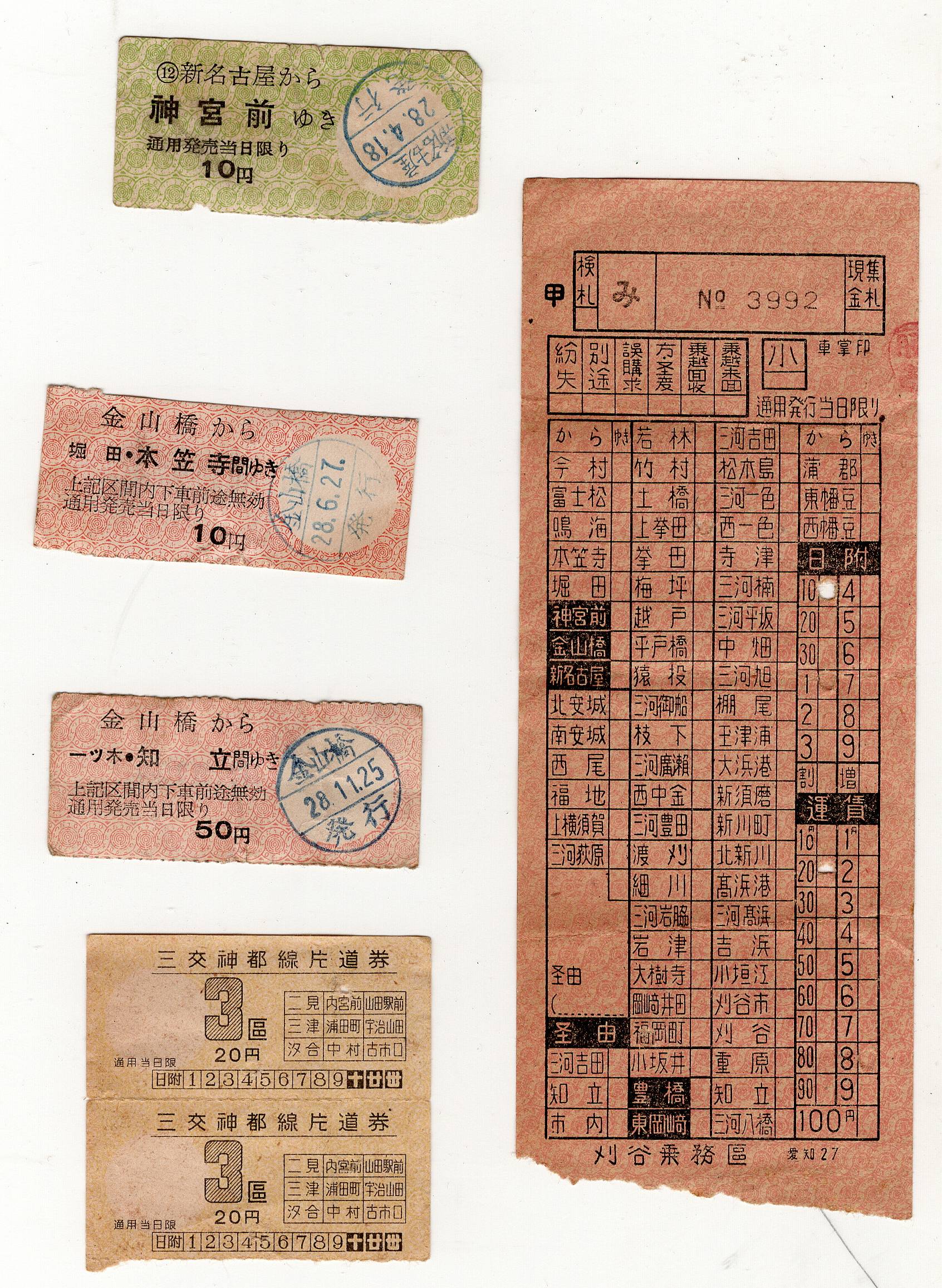 無人駅での乗車や乗越しの際、車内で車掌から購入する切符だろう。今はなき名鉄挙母線の駅名も並んでいる。わかりにくいが、福岡町の駅名の上にパンチ跡があり、上挙母の右欄にもパンチ跡がある。つまり、福岡町から上挙母までの切符という事になる。また他のパンチ跡から、乗車日が11日、運賃が28円とわかる。なお福岡町駅は、かつて存在した岡崎市内の路面電車の駅らしい。