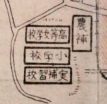 昭和2年の地図について、上から、高等女学校(現、豊田東高→博物館)、高等小学校(現、童子山小→美術館)で、実業補習学校が挙母裁縫補習学校と思われる。なお、大正14年において挙母地区の実業補習学校には、挙母裁縫補習学校と挙母第一農商補習学校が存在した(資料4 p695)。