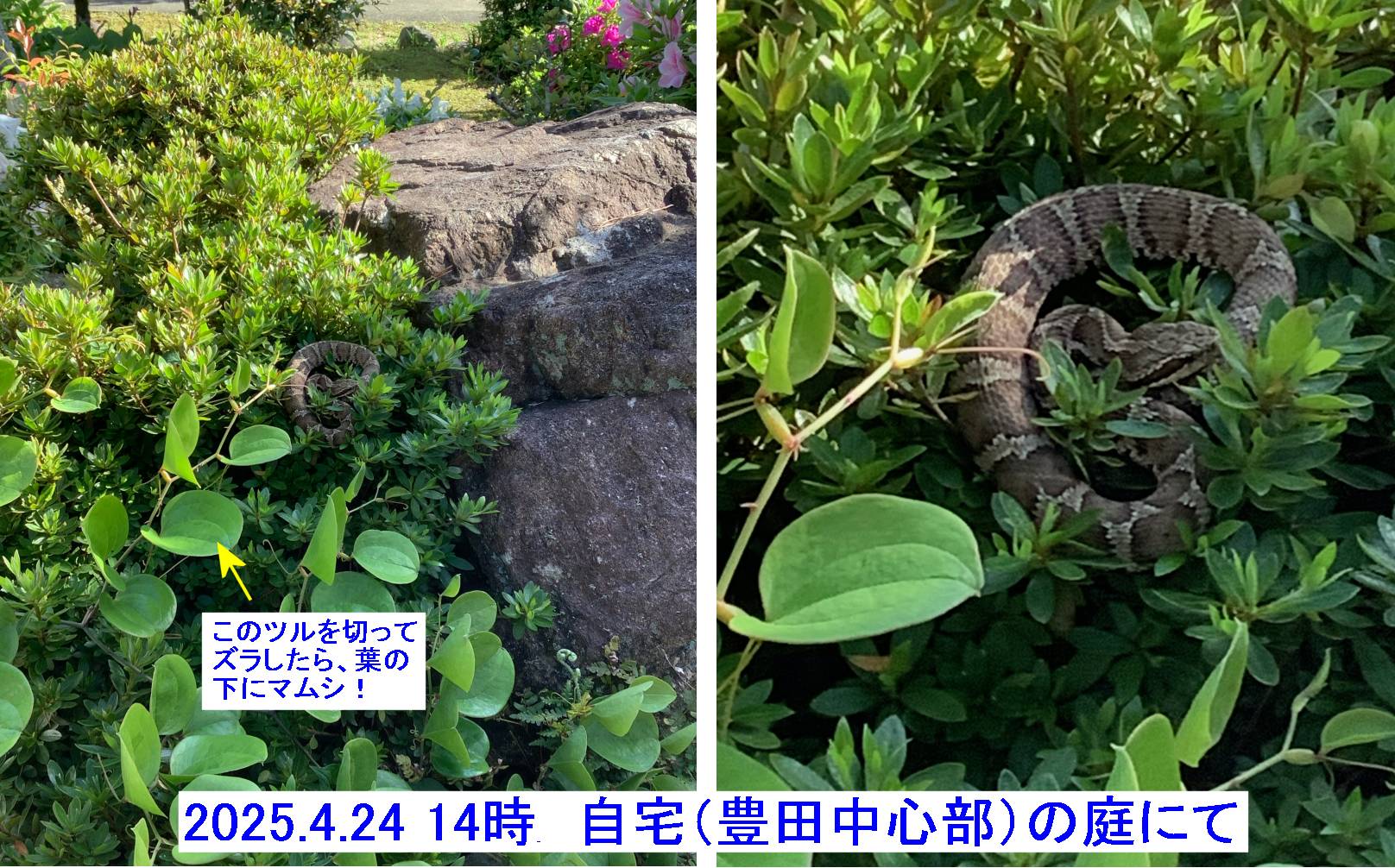 2025年4月24日14時頃、家から2m先の庭のツツジの上に、小さなツタが乗っていたので、それを切って、手前に引き寄せた。そしたら、ツタの葉の下から、ツツジの上に乗って、トグロを巻いたマムシが出できた。トグロの直径は15cmくらいで、比較的小さいので子供だろう。だが、手とマムシの距離は30cmかそこら。一瞬、来るべき時が来たと凍り付いたが、奴も死んだふりなのか、凍り付いたように動かない。